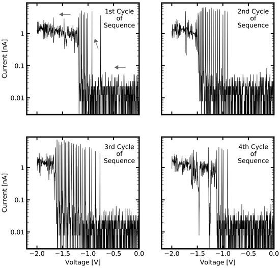 Highly dynamic HRS-LRS transitions, as observed when a memtip is operated at the border of filament stability. Shown are SET events at negative polarity extracted from four subsequent cycles. The arrows in the first panel indicate the direction of voltage sweep in these extracts (i.e., from zero towards 2 V). There is no persistent threshold switching but a dynamic behavior, arising from multiple attempts at filament formation followed by immediate disintegration.
