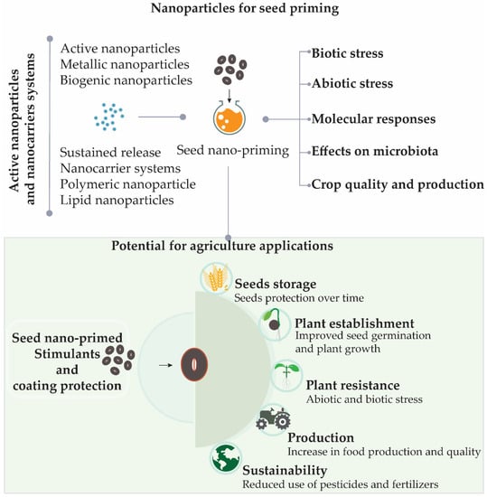 Seed nano-priming topics covered in this review and its potential benefits for sustainable agriculture. In addition to providing protection for seeds during storage, the use of seed nano-priming can result in improved establishment of plants in the soil with a reduced need for fertilizers. By growing faster, plants have an increased ability to compete with weeds for resources, consequently increasing productivity and food quality. The plants may also become more resistant to abiotic and biotic stresses, resulting in reduced use of pesticides.