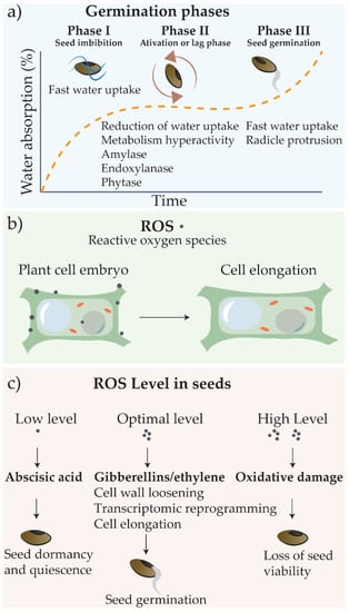 Germination phases and reactive oxygen species (ROS) effects. (a) The germination process is subdivided into three phases: phase I (water uptake), phase II (metabolic activity, with initiation of degradation of starch reserves and preparation for embryo development), and phase III (embryo development and emergence of the radicle). (b) The ROS act by destabilizing cell wall, allowing water uptake and cell elongation; (c) ROS level in seeds and hormones production.