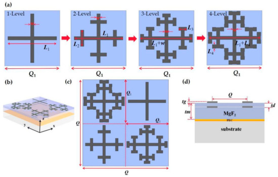 In the bottom layer, the size and arrangement of the cross shape embedded in the MgF2 dielectric layer are consistent with the first layer, as shown in Figure 1b. After repeated experiments, in order to obtain the best performance, the embedded graphene cross fractal is placed below the top layer (MgF2 dielectric layer/air interface) at a distance of td = 12 μm, that is, the distance from the ground is 33 μm in Figure 1d. The Fermi energy of the bottom layer is the same as that of the top layer, which is 1 eV. There are two reasons for the same size, arrangement and size of the two layers: first, the top layer has the best absorption rate, and the bottom layer is still the best absorption after being embedded in the dielectric layer when the Fermi energy is 1 eV; second, the same size can reduce the complexity of manufacturing and simulation and reduce process difficulties. Because it is arranged periodically, no matter where the fractal is placed, it has no great effect. Considering the complexity of the three-level and four-level fractal design, it is placed in a diagonal position, that is, a clockwise four-one-three-two level fractal arrangement, as shown in Figure 1c. Since graphene is transparent, in order to obtain a high absorption rate based on the mutual effect of adjacent cells, we optimized the structure to obtain a period of Q1 = 50 μm. The supercell period Q = 100 μm, and the graphene thickness is tg = 0.5 nm.