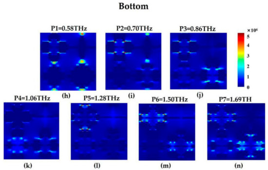 In order to better study the broadband absorption of the absorber, we use numerical analysis to further discuss the 2D electric field distribution of the resonance absorption spectra of seven high-frequency E-field distributed in two layers within a certain terahertz range, and the selected frequencies are respectively 0.58, 0.70, 0.86, 1.06, 1.28, 1.50 and 1.69 THz. Figure 5a–g corresponds to the seven resonant absorption spectra of the top layer cross-shaped two-dimensional E-field, and Figure 5h–n corresponds to the seven bottom layer resonant absorption spectra of the cross-shaped two-dimensional E-field. In order to ensure the consistency of data comparison, all electric field distributions are on the same standardized scale. It can be seen from Figure 2a,b that there are two resonance peaks in the three-level and four-level fractal. The P1 peak (0.58 THz) is mainly caused by the first resonance peak of the top and bottom three- and four-level fractals. For the P2 peak (0.70 THz), P3 peak (0.86 THz), P4 peak (1.06 THz), the electrical response is more complicated, and it is affected by the top and bottom layers and multiple fractals, or by the coupling and superposition of adjacent resonance peaks. No single layer or single fractal plays a leading role. For the P5 peak (1.28 THz) resonance is only caused by the action of the top and bottom four-level fractals, and the electric field intensity is higher than the other three levels. For the P6 peak (1.50 THz) and P7 peak (1.69 THz), the resonance is mainly caused by the three-level and four-level fractal effects, and the one-level and two-level fractals have no obvious effect on the P6 and P7 peak. To sum up, it has strong resonance in the 0.4–2 THz terahertz band is mainly caused by the interaction, coupling and superposition between the fractals.
