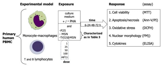 Under these conditions, lympho/monocytes (either unstimulated or PHA-activated), were used as target cells in vitro to evaluate the cyto/immunotoxicity after being induced by exposure for 6, 24, 48, 72 h in humified 5% CO2, 37 °C by TiO2@MSN, MSN and nano-TiO2 (Figure 1).