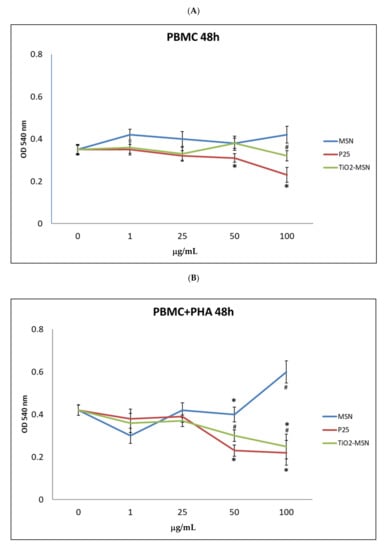 No cytotoxicity was observed after 6 and 24 h of incubation of TiO2@MSN, MSN and P25 for both PHA-stimulated and unstimulated PBMC (results not shown). After 48 h, different cytotoxicity profiles were found in PHA-activated or unstimulated PBMC. In PHA-stimulated PBMC, exposure to increasing concentrations of MSN were not associated with proportional changes of cell viability (−25% at 1 µg/mL, +33% at 100 µg/mL). Decrease of viable cells (−40%) was associated with the exposure to the highest doses (50 µg/mL and 100 µg/mL) of P25 and TiO2@MSN (Figure 2).