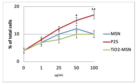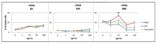 PHA-unstimulated PBMCs ex vivo in culture incubated with TiO2@MSN, MSN and nano-TiO2 for up to 48 h maintained a high rate of viable cells (90–95%); the apoptosis rate for P25 is significantly higher at 50 and 100 µg/mL (approx. 14% and 17%, respectively) compared to TiO2@MSN (approx. 10%) (Figure 3). After 72 h, as expected for primary cells ex vivo, the percent of viable cells decreased to 80–85% (data not shown).