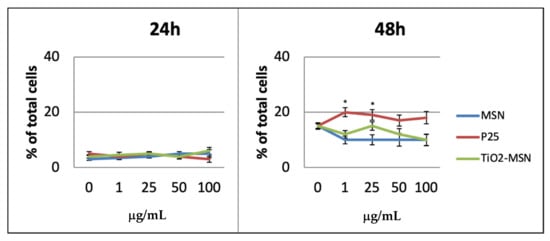 Necrosis was not observed after 6 h and appeared in low percentage after 24 h in any condition of exposure. After 48 h the highest rate of necrotic cells (approx. 18%) was associated with P25, while approx. 10% were detected for TiO2@MSN and MSN (Figure 5).