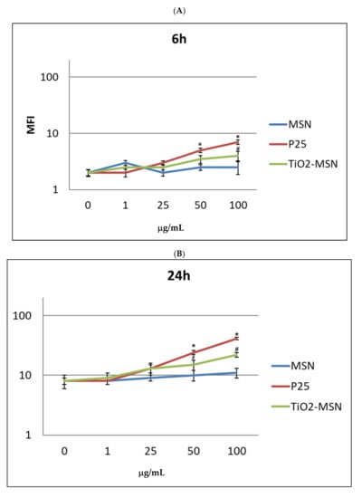 ROS increased in in vitro PBMC exposed to P25 and TiO2@MSN in a time- and dose-dependent manner from 6 h (Figure 6) to 48 h.