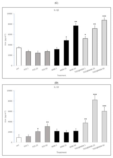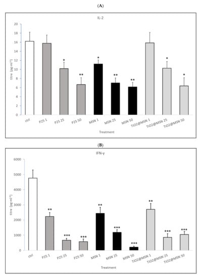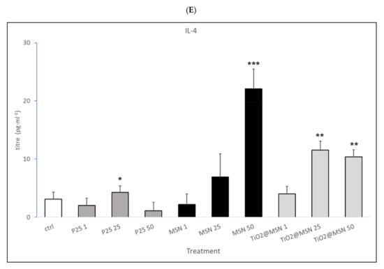- TiO2@MSN induced dose-dependent reduction of IL-2 and IFN-γ, particularly high spikes of TNF-α and dose-dependent increase of IL-1β and IL-10. Moreover, it induced a dose- and time-dependent fluctuating levels of TNF-α and IL-4, an increase of IL-17 and IL-23 as well as no significant change of (limited) IL-6 (Figure 8).