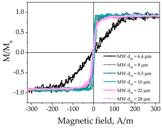 The measurements of magnetic moment were carried out using self-assembled VSM with double-split measuring coils [48]. The magnetic moment resolution was 10−3 Am2. The range of the applied magnetic field was ±800 kA/m. The field increment in the low-field range was 2.4 A/m. The measured magnetic moments were given in arbitrary units, which correlated with the induced voltage in the pick-up coils. The length of microwire samples was 1.5 cm which is sufficient to maintain the original micromagnetic structure for microwires with mentioned diameters and compositions [49].