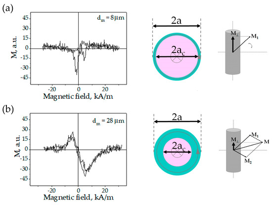 Figure 7 shows the plots of the axial magnetic moment vs. the field applied perpendicular to the wire axis (cross magnetic configuration). In the saturation field this component tends to zero since the wire is magnetized in perpendicular direction. The magnetization mechanisms are illustrated in Figure 7 (right column) where and are the magnetic moment of the core (with the axial anisotropy) and the periphery, respectively.