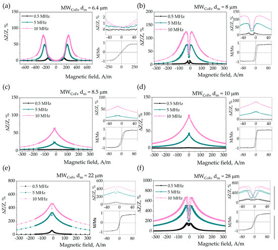 GMI field dependences at different frequencies for microwires with different metallic core diameters from 6.4 to 28 μm (a–f). Enlarged near-zero field region and hysteresis loops for the samples are included. Evolution of GMI curve shape from double peak (a,b) to single-peak (c,d) and back to double-peak (e,f) with increasing metal core diameter is observed.