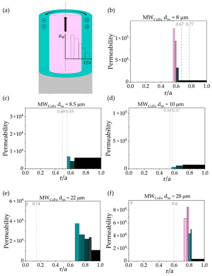 Radial distribution of the permeability of CoFe-based microwires with different diameters. (a) Schematic representation of the permeability histogram construction reflecting radial permeability distribution, (b–f) permeability distribution histograms for the samples with different metal core diameters. The height of the bar is the local permeability value and the width is the thickness of the corresponding layer. Color is used to contrast the permeabilities of different layers. The permeability calculation was done for zero DC magnetic field.