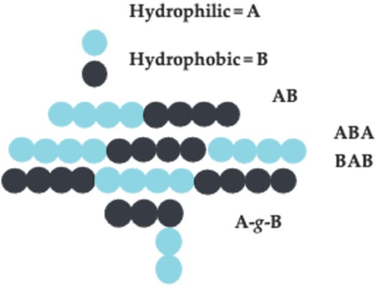 Amphiphilic block copolymers are macromolecular compounds made of identical or different types of homopolymer blocks that are covalently linked together. Block copolymers are classified based on the monomer placement along the backbone, which can either be random, alternating, graft, or block-structured. Block copolymers of the types AB, ABA, BAB, and graft copolymers, where A is a hydrophilic group and B is a hydrophobic group, are widely used in drug delivery applications (see Figure 2) []. These types of block copolymers behave like surfactants in water and can be further classified as polyions (charged polymers) or nonionic (uncharged polymers) [,]. The hydrophobic block (B) is immiscible in aqueous solutions, leading to organized self-assembly of the copolymers [,,,,].