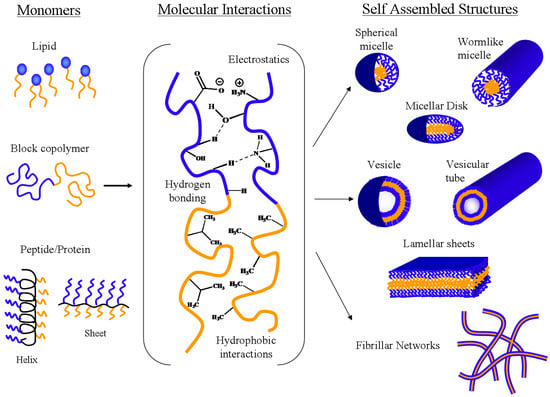 Most common self-assembled structures made from surfactants, block copolymers, and/or peptides/proteins (Reproduced with permission from []; Copyright Elsevier, 2020).