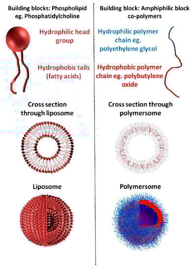 Difference Between Liposomes and Polymersomes. They are both self-assembled structures with different types of building blocks. Liposomes are made of phospholipids. While, polymersomes are made of block-copolymers (Reproduced with permission from []; Copyright Elsevier, 2020).