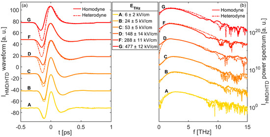 (a) Temporal waveforms and (b) their corresponding spectra retrieved via the homodyne (solid line) and heterodyne (dashed line) schemes at different THz electric field strengths, and at a fixed bias voltage of = 100 VPP ( ≈ 140 kV/cm). Curves are normalized to their own maxima and vertically shifted for clarity.