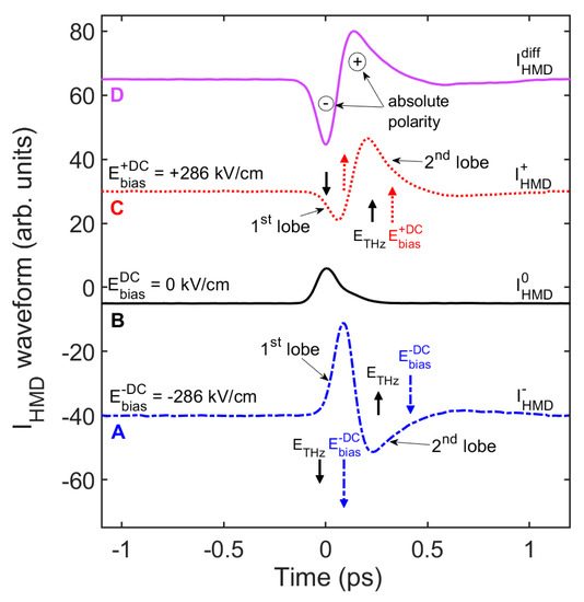 In Figure 3, the shape of the recorded waveforms at negative bias voltages is not simply specular with respect to the positive counterparts. In particular, in Figure 4 we focus the attention on the waveforms retrieved for = 286 kV/cm (curves A and C), compared to the purely incoherent and differential waveforms (curves B and D, respectively). Although it is not ultimately possible to detect the exact true form of a THz pulse, due to the non-flat spectral response affecting any type of THz detector, the SSBCD homodyne scheme allows us to obtain a crucial insight regarding the absolute polarity of the THz pulse. In the incoherent curve (B), retrieved for a THz strength of ETHz = 150 kV/cm, the two pulse lobes are merged together and not distinguishable. However, when the 286 kV/cm-bias is applied, the first lobe is amplified by the negative DC field value [, curve A], whereas it is attenuated and even reversed in sign by the positive bias value [, curve C]. The opposite effect occurs for the second lobe. Therefore, considering Equation (4), since the incoherent term must be inherently a positive quantity (, curve B), we conclude that the THz pulse begins to emerge in the presence of a negative lobe, followed by a positive lobe (curve D). Such an information cannot be easily obtained through the heterodyne scheme, since in this case the lock-in amplifier acquires the data to within a ±π-phase uncertainty.