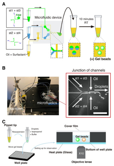 In order to observe the morphology of the DNA beads, we resuspended them in an aqueous buffer (made by adding 150 mM NaCl to 1× Tris-EDTA buffer pH 8.0, and then vortexing for 30 s). (Note that in the present study, “droplets” refer to vesicles of water in oil, while “beads” refer to spherically-shaped microgels of DNA strands). We observed the gel beads in microwell plates (PerkinElmer, Waltham, MA, USA) with epifluorescence microscopy (Ti-2, Nikon, Tokyo, Japan) using a 10× objective (Nikon, Tokyo, Japan) and appropriate filters (Figure 2C). To remove the oil phase, we first mixed the emulsion coming out of the device with isopropanol in a buffer (1μL of isopropanol, 1μL of droplet, and 8 μL of buffer). After that, we put this solution in the well plate and filled it up to 50 μL with a buffer. In order to avoid bias in the number of gel beads between samples, the tube contain hydrogel beads was well stirred before transfer of the beads to the well plate. Furthermore, we closed the well with a PCR film (Biorad, Hercules, CA, USA) to prevent evaporation of the solution.
