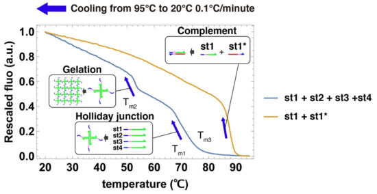 We acquired cooling curves of the DNA gels to estimate their characteristic temperatures (Figure 4) [75]. Two large fluorescence jumps were observed during the cooling of the 4 strands that compose the gel. The first jump occurred around Tm1 = 68 °C, which we assign to the assembly of the 4 strands into a Holliday junction [66,76]. The second jump occurs at Tm2 = 52 °C, which we assign to the mutual binding of Holliday junctions by their sticky ends into a gel. This temperature Tm2 gives the upper limit of stability for the gelation process. We also measured the cooling curve for the hybridization of st1 with its complementary strand st1*, a process that we use later to disrupt the Holliday junction and dissolve the gel. As expected, the duplex is more stable (Tm3 = 87.5 °C) than the Holliday junction because DNA bases are fully paired and there is no entropic linker. This measurement supports the assumption that st1* can thermodynamically drive the disruption of the Holliday junction.