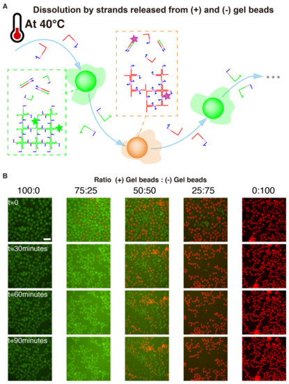 Winner-Takes-All competition between gel beads. (A) (+) and (-) gel beads are perfectly complementary, and should mutually “dissolve” each other to leave only fully paired duplexes. However, this process is slow at room temperature. We hypothesized that heating the solution would catalyze this thermodynamically downhill process. Once a strand is peeled from a X-motif, this exposes more single-stranded domains which can react with their complement in the other population of gels. (B) Fluorescence time-lapse of gel beads and (-) gel beads mixed in various ratios at 40 °C. The scale bar is 150 µm.