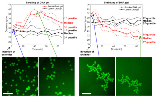 We experimentally tested the swelling and shirking of gel beads (Figure 7). Starting from gel beads comprising bridges (median diameter of 30 μm), we added extender strands to the well. The gel beads swelled up by ~30% in ~50 min, reaching a median diameter of ~38 μm (Video S1). During this time, the size of beads in the control well remained stable. After about 50 min, the beads slightly shrunk spontaneously, for reasons that are unclear. The magnitude of swelling is also lesser than expected, which may be due to various reasons. (Bridges compete with the native sticky ends during gelation, and may not be completely inserted in the matrix. Or the extending strands may not be able to diffuse fully inside the gel matrix, limiting the number of bridges which are extended.) In any case, the speed and magnitude of swelling is consistent with other reports using strand displacement to actuate DNA gels [43,78]. We then demonstrated shrinking of the DNA gel beads by adding remover strands that peel off the extended from the bridge. The median diameter shrunk from ~31 μm to ~20 μm over the course of ~80 min (Video S2). Overall, the reversible shrinking and swelling suggest that our DNA hydrogel design worked as expected, and could find applications in drug delivery.