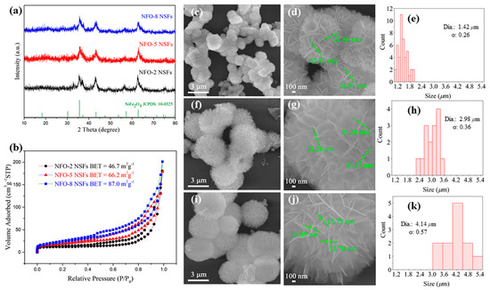 The XRD patterns (a) and nitrogen adsorption–desorption isotherms and Brunner–Emmet–Teller (BET) surface area values (b) of NFO-2, NFO-5 and NFO-8 nanosheet-assembled flowers (NSFs); SEM images and flower size distribution of NFO-2 NSFs (c–e), NFO-5 NSFs (f–h) and NFO-8 NSFs (i–k).
