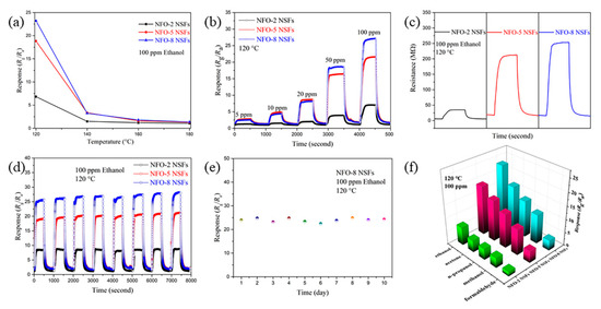 (a) Gas-sensing response versus operating temperature of the sensors upon exposure to 100 ppm ethanol; (b) the response versus time of the sensors upon exposure to ethanol ranging from 5 to 100 ppm; (c) the resistance transient of the sensors; (d) the reproducibility testing of the sensors; (e) the long-term stability of the NFO-8 NSFs-based sensor measured for 10 days. (f) Comparison of the responses of the sensors for various gases.