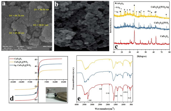 (a,b) FESEM images of the Ag-CuFe2O4@WO3 nanoparticles at different magnifications (the scale bar in (a) represents 200 nm); (c) XRD spectra for the Ag-CuFe2O4@WO3 nanoparticles; (d) magnetic behavior of the Ag-CuFe2O4@WO3 nanoparticles; (e) FTIR spectra of the Ag-CuFe2O4@WO3 nanoparticles representing their various bonds and functional groups.