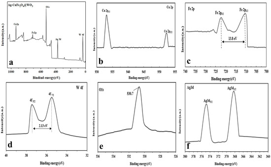 Based on the XPS analysis (general spectrum), surface composition of the Ag-CuFe2O4@WO3 nanoparticles consists of Fe, Cu, W, Ag, and O atoms (Figure 2a). More precisely monitoring, Figure 2b shows that the Cu binding energy is represented in the two peaks of 933 and 953 eV, which are attributed to Cu 2p3/2 and Cu 2p1/2, respectively. There are two distinct peaks in the Fe 2p spectrum, appearing at 710.7 and 724.5 eV, corresponding to the binding energies of Fe 2p1/2 and Fe 2p3/2, respectively [39] (Figure 2c). The mentioned binding energies arise from CuFe2O4. After coating CuFe2O4 with WO3, as shown in Figure 2d, two new signals appear at 35.47 and 37.6 eV corresponding to W4f7/2 and W4f5/2, respectively. The peaks are separated with a gap of 2.13 eV [40]. Figure 2e shows the O1s spectrum of the nanoparticles with a binding energy peak at 530.7 eV, attributed to oxygen at the W-O bond [41]. The Ag3d surface spectrum of the nanoparticles possesses two peaks with the binding energies of 368.3 eV and 374.10 eV, as shown in Figure 2f, that are attributed to Ag3d5/2 and Ag3d3/2, respectively. The 5.8 eV gap between the two peaks indicates the presence of Ag. Noteworthy, with no track of Ag+, it can be confidently said that Ag ions have been reduced to metallic silver in the nanocomposite particles [5].