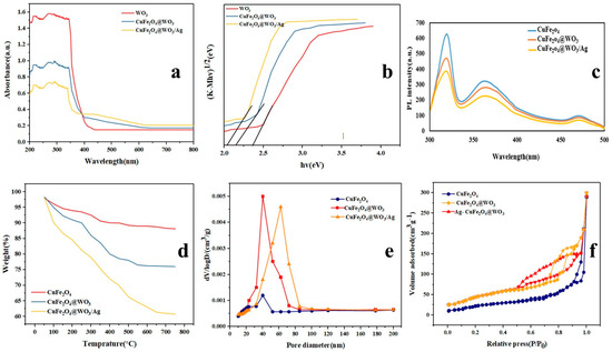 (a) UV–Vis DR spectra and (b) band gap energy curves of the Ag-CuFe2O4@WO3 nanoparticles compared to those of the WO3 and CuFe2O4@WO3 nanoparticles; (c) photoluminescence (PL) analysis of the Ag-CuFe2O4@WO3 nanoparticles; (d) TGA curve for the Ag-CuFe2O4@WO3 nanoparticles in comparison with the controls; (e) the pore diameter distribution curves and (f) N2 adsorption/desorption isotherms of the CuFe2O4, CuFe2O4@WO3, and Ag-CuFe2O4@WO3 nanoparticles.