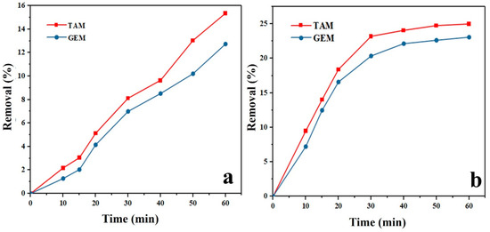 where C0 and Ce were the initial concentration and pollutant equilibrium concentration (mg/L), respectively, V the volume of the TAM and GEM solutions (mL), and m the mass of Ag-CuFe2O4@WO3 (mg). As Figure 4a,b shows, the removal percentage of TAM and GEM contaminants under photolysis and adsorption was insignificant ( less than 30%).