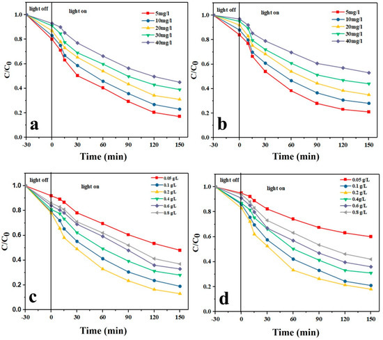 Effect of initial drug concentration on the photocatalytic degradation of (a) TAM and (b) GEM; effect of the photocatalyst dosage on the photocatalytic degradation of (c) TAM and (d) GEM.