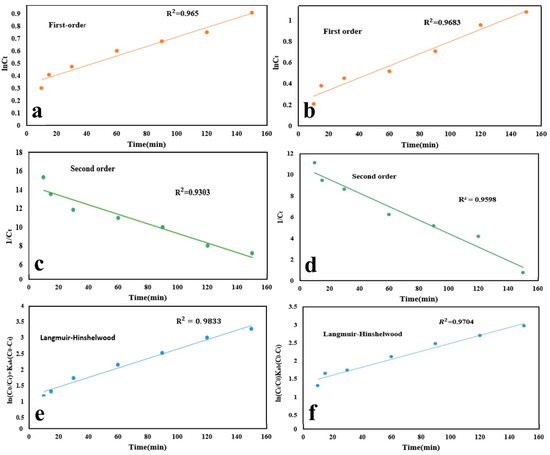 Kinetic plots of photodegradation process of (a,c,e) TAM and (b,d,f) GEM, obtained through several kinetic models of first-order, second-order, and Langmuir–Hinshelwood.