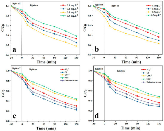 Inorganic anions are of the substances typically seen in real secondary wastewater effluents and notably impact on the catalytic reactions [58]. Figure 8c,d shows the effect of addition of different anions such as Cl−, SO42−, NO3−, and CO32− on the photocatalytic degradation of the drug models by the Ag-CuFe2O4@WO3 nanoparticles. The inhibiting effect of the mentioned anions on the photodegradation efficiency of the nanoparticles follows the order of Cl− > SO42− > CO32− > NO3−. These anions can compete with the drug molecules for the available active sites on the photocatalyst surface, thereby inactivating the photocatalyst [58]. Moreover, the reduction in photodegradation efficiency is attributed to the electrostatic repulsion and the limited active sites in the catalyst [59,60]. In fact, on the catalyst surface these anions act as receptors for •OH radicals, leading to increased electron and hole recombination. The reason for the significant reduction in the photocatalytic degradation efficiency in the presence of CO32− and NO3− ions is that these ions act as pH buffers and render the solution alkaline and thereby the surface of the photocatalyst hydroxylated. The as-charged surface repels the drug molecules electrostatically and thus lowers the adsorption capacity of the photocatalyst nanoparticles and their photodegradation efficiency. Furthermore, the free radicals generated at the photocatalyst surface are trapped by CO32− and NO3− anions and cannot participate in the degradation process [40].