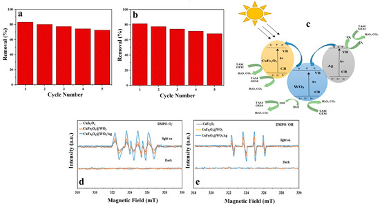 Reusability of the Ag-CuFe2O4@WO3 photocatalyst after five cycles of photodegradation of (a) TAM and (b) GEM; (c) photodegradation pathway of the drug models by the Ag-CuFe2O4@WO3 nanoparticles; ESR spectrum of (d) DMPO-◦O2 and (e) DMPO-◦OH compound for the CuFe2O4, CuFe2O4@WO3 and Ag-CuFe2O4@WO3 nanoparticles under UV irradiation.