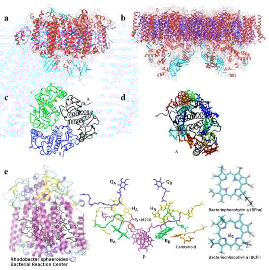 Structure of photosystem I (PSI, (a)) and photosystem II (PSII, (b)) from pdb entry 1JB0 and 3WU2, respectively. Trimeric light-harvesting complex (LHC II) complex from pdb entry 2BHW; the different chains are indicated by different colors (c); chlorophyll residues in chain A, in which the Chl residues are colored in yellow and red tones (d). Reproduced from [] with permission from The Royal Society of Chemistry, 2011. Representation of the BRC of Rhodobacter sphaeroides based on X-ray study (e). The core pigment units are the P, and the pairs of BChl, and BPhe, shown in the central part along with representation of their neighbouring pigments that form the distinct effective dielectric for the two branches. Reprinted with permission from []. Copyright (2019) American Chemical Society.
