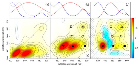 Comparison of simulated (d,e) and experimental (f) 2DES pump-probe maps of Rps. acidophila at 300 K and waiting time t2 = 22 fs. The corresponding linear absorptions (blue) and pulse shapes (red), along with the relative experimental linear spectra (dashed line), are reported in (a–c), respectively. In the calculated maps the pulse shape was adapted to have the same overlap between pulses and absorption bands as the one reported in the experiments. Panel (e) refers to a calculated map where Car S2 site energies and Qx transition dipoles have been scaled to match the position and the intensities measured in the linear spectrum. Simulated maps are normalized to their maximum. By convention, bleach and stimulated emission contributions appear as positive (red) signals, excited state absorption appears as negative (blue) peaks. Full (referring to Cars) and empty (referring to BChls) geometric symbols are used to indicate correlations between calculated and measured signals. Reprinted with permission from []. Copyright (2017) American Chemical Society.
