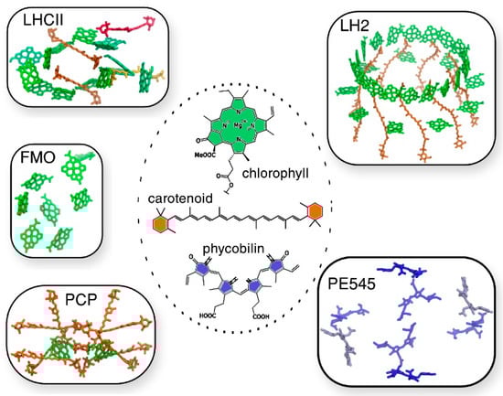 Examples of multichromophoric aggregates as found in different LH complexes. Starting from the left upper corner we see the major LH complex of plants LHCII (here represented in its monomeric form), the LH2 from Rhodoblastus acidophilus (purple non-sulfur bacteria), the phycoerythrin 545 (PE545) antenna of Rhodomonas sp. (marine algae), the peridinin–chlorophyll a–protein (PCP) from Amphidinium carterae (oceanic plankton) and the Fenna–Matthews–Olson (FMO) complex of Prosthecochloris aestuarii (green sulfur bacteria). In the central ellipse a schematic representation of the different types of pigments is reported; namely (bacterio)chlorophylls, carotenoids and bilins. Reprinted with permission from []. Copyright (2020) Elsevier.