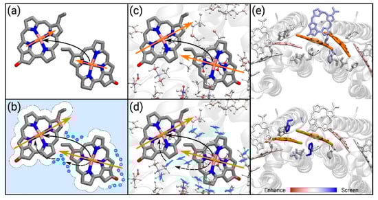 (a) Electronic coupling computed in vacuo. The interaction is between the two transition dipoles. (b) Electronic coupling computed in a polarizable continuum scheme. The transition dipoles are enhanced by the environment and, in addition to the dipole–dipole interaction (solid arrow), there is an interaction through the environment (dashed arrows). (c) Electronic coupling computed in a MM electrostatic embedding. The transition dipoles are enhanced by the environment, but there is no screening effect. (d) Electronic coupling computed in a MM polarizable embedding (MMPol). The transition dipoles are enhanced and there is an interaction through the environment. (e) Effect of the polarizable environment on two non-equivalent electronic coupling of the LH2 (blue: Screening, red: Enhancing). Note how the histidines coordinating the BChls reduce the second coupling while they do not affect the first. Reprinted with permission from []. Copyright (2020) Elsevier.