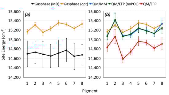 As the authors of this study also remarked, the QM/MM is one of the most critical step in the whole procedure, together with the excited state calculations in the polarizable embedding, due to (i) limitations of the classical force field and (ii) large pigment fluctuations. Moreover, they provide evidence of the effect of polarizable MM over the site energies values (Figure 7), demonstrating the importance of correcting the pigment structures are the QM level before excited state analysis. In addition, the QM/EFP method provides a rigorous description of intermolecular interactions, without further parameterizations needed [,,], in which the system is divided in rigid fragments and the interaction between them is the sum of different terms such as polarization, dispersion, Coulomb and exchange-repulsion [,,], which allow for the study of highly anisotropic systems such as LHP. We remark here that the QM/EFP model used is not the same as QM/MMPol, because in QM/EFP the polarization is treated as an effective 1-electron operator, and it uses both polarizabilities and multipoles to account for self-consistent polarization. Within this approach, the excitonic properties of the FMO complex resulted in an excellent quantitative agreement with experiments, and also previous empirical computations. This is particularly impressive for the circular dichroism spectra, for which all the major features were reproduced.