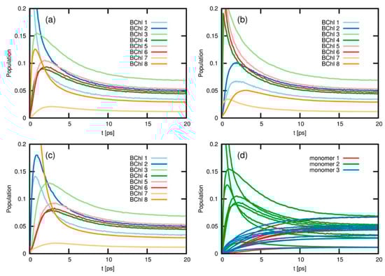 A different methodology for the simulation of energy- and charge-transfer processes is based on the iterative quasi-adiabatic propagator path integral (iQUAPI) approach []. This method relies on an improved numerical exact path integral quantum dynamics merging performance via mask-assisted coarse graining of Feynman-Vernon influence coefficients (MACGIC-iQUAPI). Thus, it allows for simulation of charge and energy transfer dynamics of extended systems in the intermediate regime of system bath coupling, in which Born–Markov approximation cannot be used, with convergence towards numerically exact results. It has been tested on benchmark problems ranging from simple 2-state spin-boson models up to fully coupled 24-state models of the FMO complex. MACGIC-iQUAPI is able to successfully cover parameter regimes of coherent and incoherent excitation energy transfer in dissipative quantum systems subject to classical environment with long-time bath memory as well as charge-transfer dynamics including quantum phenomena such as super-exchange on the same footing []. Its application to FMO complexes is of particular interest in the present context, as it was possible to obtain the long time EET equilibration dynamics on the FMO trimer and study the population of different excited states after 20 ps (Figure 8). As result, the authors observed that depending on the initial excitation conditions, different times are needed for the population to equilibrate, and this is strongly dependent on the nature of the coupling between the chromophores, going from weak (Redfield limit) to intermediate and strong (Förster limit) system bath regimes. The authors also indicate that the MACGIC-iQUAPI algorithm is useful in the description of EET coherent dynamics coupled to steady state equilibration in the Förster ET regime.