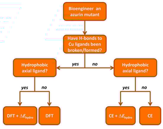 Recently, a comprehensive QM/MM approach for a large dataset of reduction potentials of mutants and an efficient and reliable computationally procedure has been reported []. The authors consider both continuum electrostatics and DFT methods on 24 azurin mutants, and found that the first gives good agreement with experimental observation despite its low computational cost and somehow high degree of approximations. Yet, it failed in properly describing the reduction potentials when explicitly hydrogen bonds are present and when hydrophobic axial ligands are considered. When hydrogen bonds are created/deleted through mutations, DFT or QM/MM approaches are needed. The introduction of hydrophobic ligand lead to a failure of DFT in predicting reduction potentials, and the authors suggest the introduction of a “hydrophobicity factor” through the Kyte–Doolittle hydrophobicity index ΔΚD []. In addition, when a combination of hydrogen bonds and hydrophobic axial ligands are present, DFT should be used to compute the reduction potential of the redox center (primary sphere) and the continuum electrostatic model for changes in the secondary sphere and the resulting total reduction potential is the sum of the two terms, in an approach similar to the ONIOM method. Finally, the authors reported an extensive prediction study on over 124 azurin mutants, for which they also provide a general scheme to be followed, in an elegant way, which might be used also for different PPCs (Figure 11).