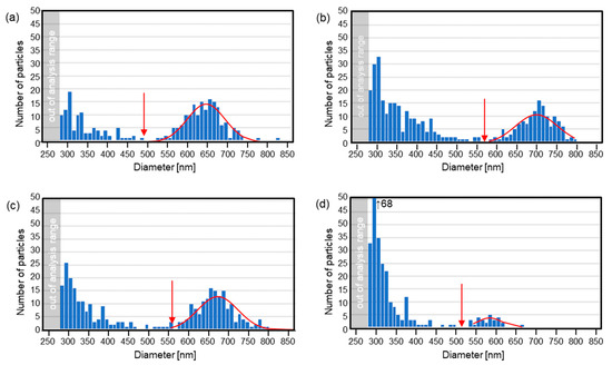 Nanodot size distributions. The averaged fluence was (a) 106, (b) 94, (c) 84, and (d) 75 mJ/cm2, respectively. Alphabetical numerals correspond to those in Figure 4. The red curve on each graph corresponds to a normal distribution fit on the data set starting from the red arrows to the right in each case.