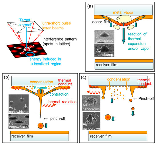 The first laser-induced forward transfer (LIFT) technique was examined in 1970 [1]. It was called as “laser typewriter”, in which an ink ribbon was used as a source target. In this technique the irradiated region is transferred to the receiver substrate, as shown in Figure 1a. The target thin films were extended to various materials such as metals [2], dielectrics [3], biomaterials [4], and fluorophore [5], and microscopic process measurement techniques using image laser spectroscopy have been applied to investigate the LIFT process [6,7]. The laser-induced dot transfer (LIDT) technique, a type of LIFT, was developed for depositing nanodots which are smaller than laser wavelengths [8,9,10,11]. The mechanism involves the liquid behavior of solute metals and their freezing, called the solid–liquid–solid (SLS) mechanism [12]. Here, SLS enables the fabrication of a variety of nanostructures other than nanodots using LIDT, such as the nanobump [13], nanodrop [13,14], nanowhisker [12,15], nanocrown [15,16], etc. Furthermore, we have investigated interference laser processing for two decades. In these studies, the aligned nanostructures mentioned above have been successfully fabricated in a single shot of laser irradiation. We applied this technique to LIDT as shown in Figure 1b, and aligned Au nanodots with μm square matrices were successfully deposited [17].
