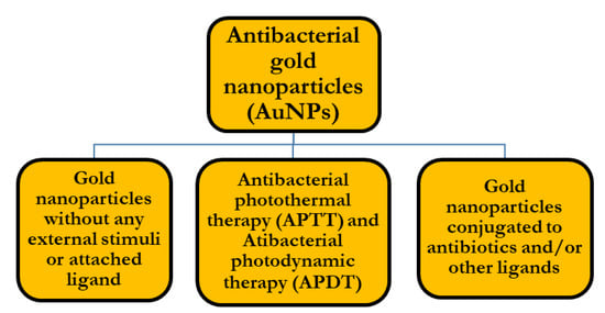 In our review, we categorized the antibacterial gold nanoparticles into three main groups, based upon the antibacterial approach used by researchers and as shown in Figure 3.