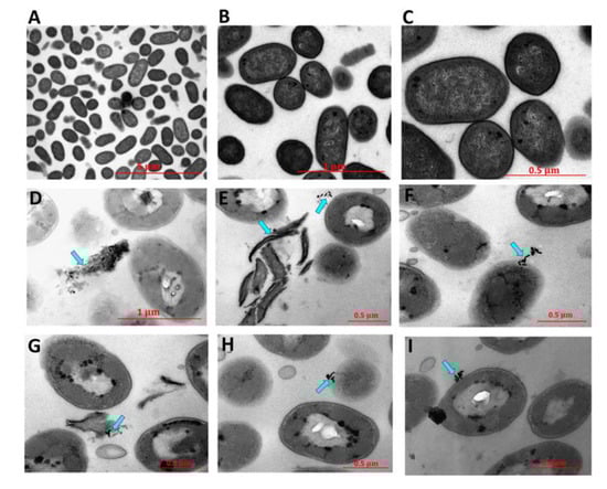 TEM images of untreated Pseudomonas aeruginosa (A–C) and after treatment with DSPE-AuNR and excitation with a continuous (CW) laser beam (D–I). Photothermal therapy resulted in significant changes in the morphology of the bacteria and lysis of bacterial cells. Reproduced from [], with permission from MDPI, 2019.