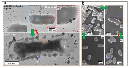 (a) TEM micrographs of localized MB@GNPDEX-ConA on K.Pneumoniae-12 bacterial surface and treated (for 100 s = 142.9 J cm−2) bacterial cell (after 60 min). The micrograph shows the cytological mass with aggregated nanoconjugates (yellow arrow) and cell surface perturbation (violet arrow). (b) The morphological perturbations shown by SEM micrographs. (b,b1) The intact and uniform morphology of control cells and (b,b2,b3) bacterial aggregation due to concanavalin A (ConA)-mediated attachment of nanoconjugates (violet arrow). (b,b4) The micrograph shows cell membrane destruction (violet arrow) after photosensitization. Reproduced from [], with permission from Elsevier, 2017.