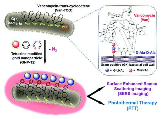 H.Wang et al. synthesized in a recent study [] a novel, intelligent, and safe theranostic system based on a bacteria-induced gold nanoparticle (GNP) aggregation, offering both high levels of efficiency for bacterial surface-enhanced Raman scattering (SERS) imaging and for antibacterial photothermal therapy. By employing the bioorthogonal cycloaddition technique, tetrazine-modified gold nanoparticles (GNP-Tz) orthogonally reacted with a trans-cyclooctene derivative of vancomycin (Van-TCO) in situ via instantaneous cycloaddition to form aggregated GNPs on the bacterial surface, as shown in Figure 7. A plasmon coupling effect was generated between adjacent GNPs which induced a strong electromagnetic field and high NIR absorption. Due to this, an effective surface-enhanced Raman scattering (SERS) imaging and photothermal ablation of the bacterial pathogens was achieved. The unique thing about this system is that in the absence of bacterial cells, GNPs were dispersed and showed very low levels of photothermal activity, which minimized side effects on the surrounding healthy tissues while maintaining a targeted bactericidal effect.