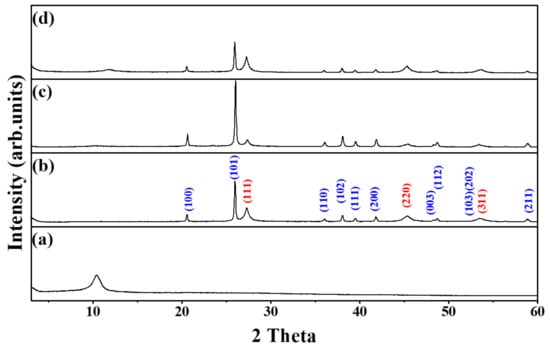 X-ray diffraction (XRD) patterns of (a) GO, (b) Ge/GeO2 nanoparticles (NPs), (c) the as-prepared composite (Ge/GeO2/GO), and (d) Ge/GeO2/MRGO (microwave-treated reduced graphene oxide). Blue-colored indices are from the cubic Ge, while red-colored ones are from the hexagonal GeO2.