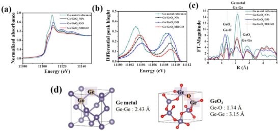 (a) Ge K-edge X-ray absorption near edge structure (XANES) spectra, (b) first derivative of the XANES spectra, (c) Fourier transforms (FTs) of k3-weighted EXAFS spectra of the samples, (d) 3D visualization of cubic Ge and hexagonal GeO2 crystal.
