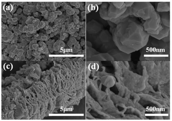 Scanning electron microscope (SEM) images of (a,b) Ge/GeO2 NPs, (c,d) Ge/GeO2/MRGO.